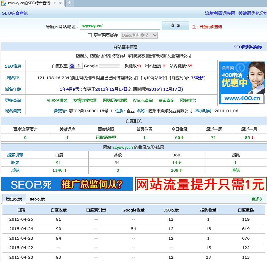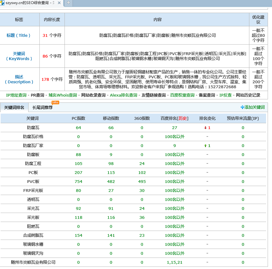 小編在這隨州市炎順瓦業(yè)有限公司防腐瓦企業(yè)從事網(wǎng)絡(luò)運營已經(jīng)超過一個月了,從開始什么都不懂,到現(xiàn)在什么都懂了。今天一早,我用站長工具查詢http://szyswy.cn網(wǎng)站關(guān)鍵詞防腐瓦廠家的排名,驚奇的發(fā)現(xiàn),哇!防腐瓦廠家關(guān)鍵詞排名竟然提升到第九位了,防腐瓦關(guān)鍵詞排名26名了。這一個多月,小編每天更新網(wǎng)站的內(nèi)容不斷發(fā)帖子,小編的不懈努力之下,排名終于有了起色。從之前的100名以外上升到第9名,萬萬沒想到百度權(quán)重從0升到1,這讓小編感到只有付出努力才能有收獲。其實,小編覺得,網(wǎng)站不是每天更新的內(nèi)容越多,網(wǎng)站排名就越好的。網(wǎng)站排名怎么樣才能靠前,首先,更新的內(nèi)容要高質(zhì)量,能吸引訪客來閱讀,最好是原創(chuàng)真實有意義的文章,多發(fā)帖子,每天更新東西要新穎,看百度收不收錄,收錄多的話排名就越容易靠前。對于網(wǎng)絡(luò)運營,小編不是很懂,但是小編知道,每天用心寫東西,不用百度推廣照樣靠前排名,一樣能讓企業(yè)網(wǎng)站搜索關(guān)鍵詞靠前,網(wǎng)站優(yōu)化是個漫長工作,想要弄清楚摸透,必須鉆研學習SEO,所以,從最基本的優(yōu)化網(wǎng)站開始,一點一滴積累經(jīng)驗是很關(guān)鍵的。作為網(wǎng)絡(luò)專員,看見企業(yè)的網(wǎng)站排名靠前,還是很欣慰的,每天優(yōu)化網(wǎng)站讓小編覺得是件有意義的事情,而不是單單的因為是工作而去做。本網(wǎng)站文章為隨州市炎順瓦業(yè)有限公司版權(quán)所有,未經(jīng)同意,不得轉(zhuǎn)載,否則追究其法律責任的哦!隨州市炎順瓦業(yè)有限公司專業(yè)生frp采光瓦,FRP防腐瓦,frp阻燃瓦,frp平板,PVC防腐瓦,PC瓦,玻璃鋼水槽等等屋面建材,歡迎新老客戶前來選購。